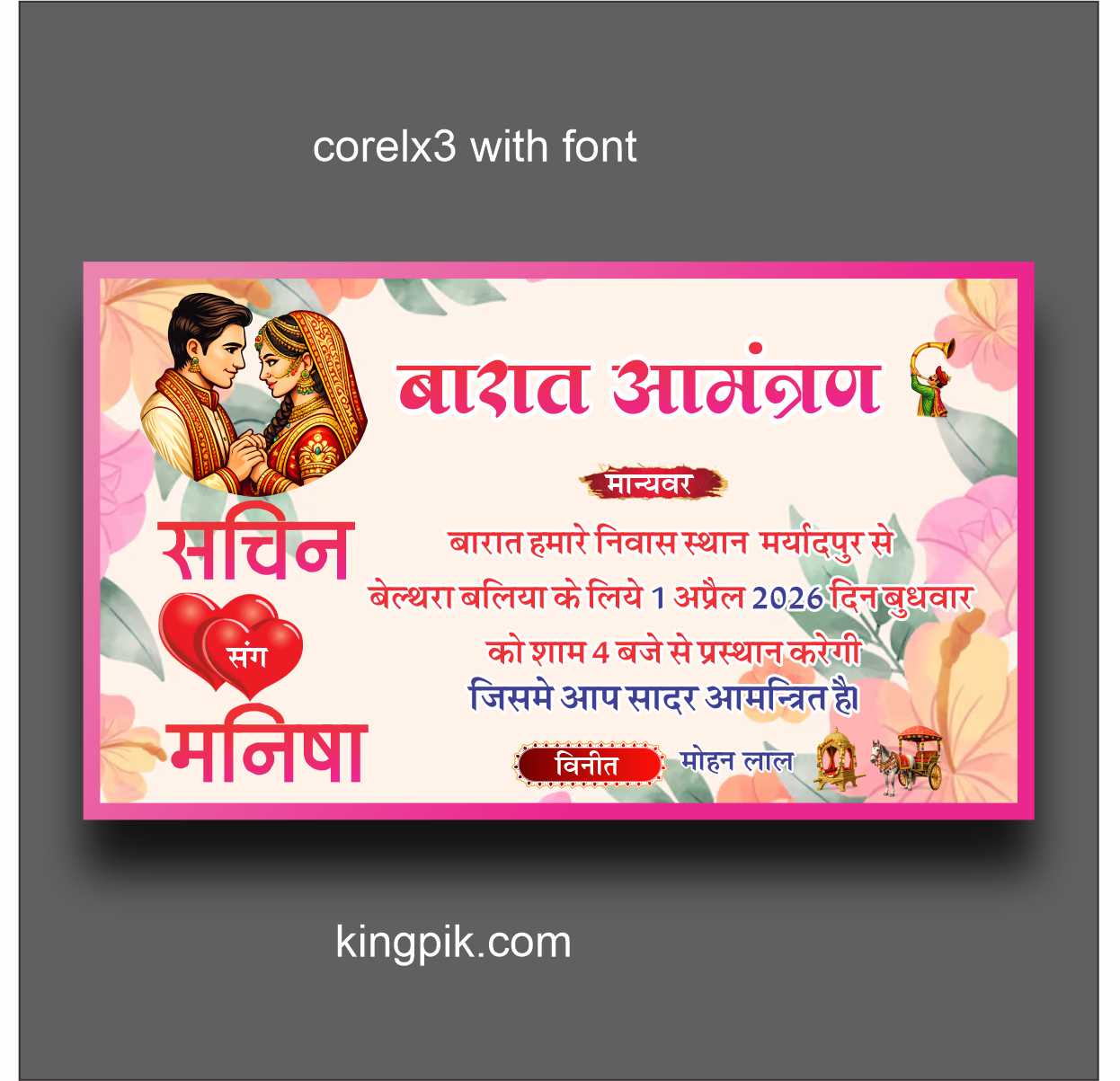 यह डिजाइन CorelDRAW (CDR) फाइल में उपलब्ध है, जिसे आप आसानी से एडिट कर सकते हैं। इसमें आप दूल्हे का नाम, स्थान, समय और अन्य जानकारी अपने अनुसार बदल सकते हैं। यह डिजाइन प्रिंट के लिए पूरी तरह तैयार है और इसका लेआउट साफ, आकर्षक और पारंपरिक स्टाइल में बनाया गया है।