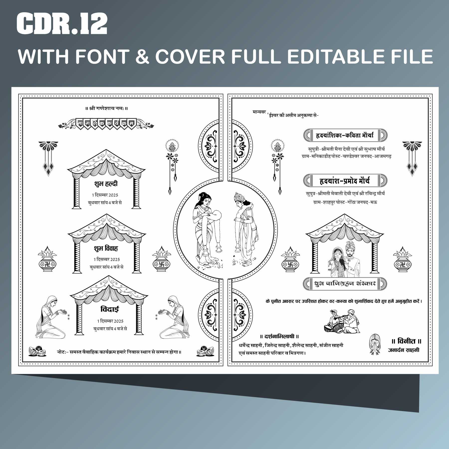 Yeh templates CorelDRAW me fully editable hote hain, jisme aap var-vadhu ka naam, wedding date, venue, family details aur invitation message easily customize kar sakte hain. Yeh CDR files print-ready format me available hain aur digital share ke liye bhi best hain.