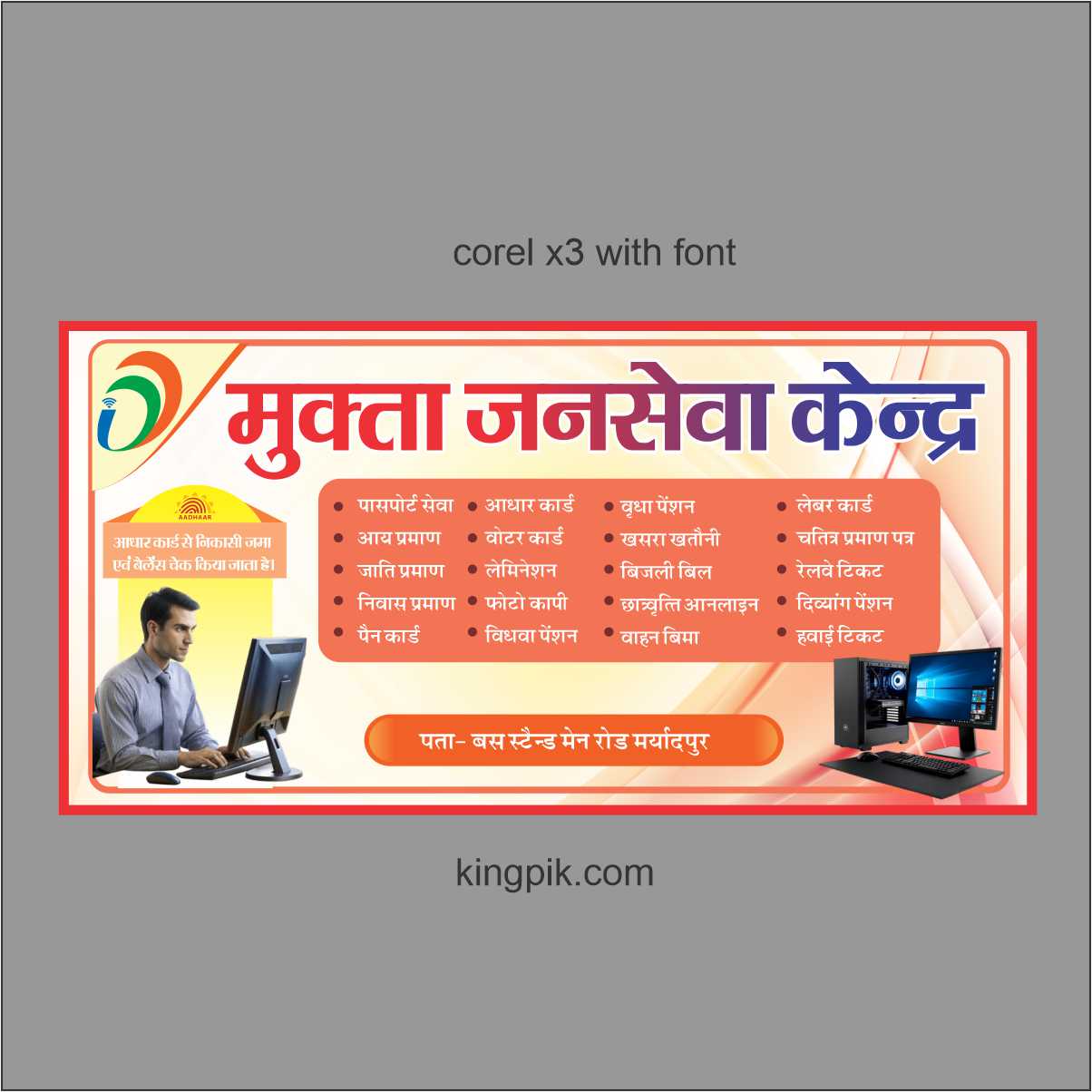 यह CorelDraw (CDR) file fully editable है, जिसमें आप आसानी से services list जैसे Aadhaar Card, PAN Card, Voter ID, Passport, Online Form, Electricity Bill Payment, Train Ticket Booking आदि add या edit कर सकते हैं। साथ ही shop name, address और contact details भी आसानी से customize कर सकते हैं।