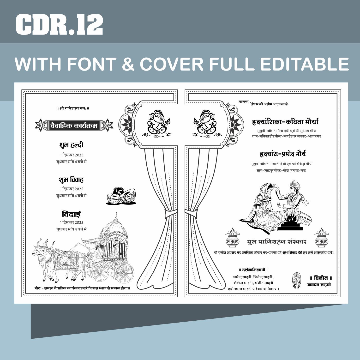 This fully editable CorelDRAW (CDR) file allows you to customize bride and groom names, wedding date, venue, and all ceremony details as per your requirement. Suitable for Hindu शादी कार्ड, lagan patrika, and modern wedding invitations.