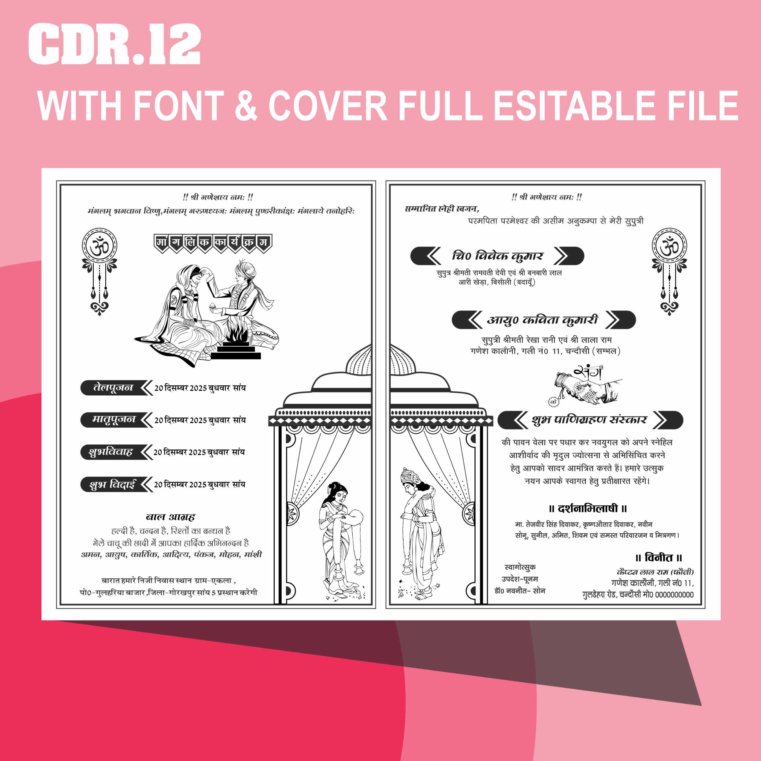 This format can be easily used in CorelDRAW (CDR), Photoshop, or any designing software, allowing you to customize names, fonts, and layout according to your needs. Perfect for designers, print shops, and individuals who want to create high-quality wedding cards.